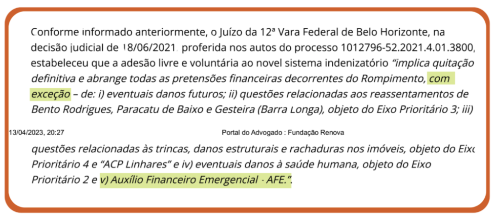 Um dos momentos que gerou maior frustração entre os representantes do território foi o posicionamento do MPF acerca do Acordo Novel. Segundo a instituição, o termo de quitação assinado pelos atingidos também abrangeria o AFE.