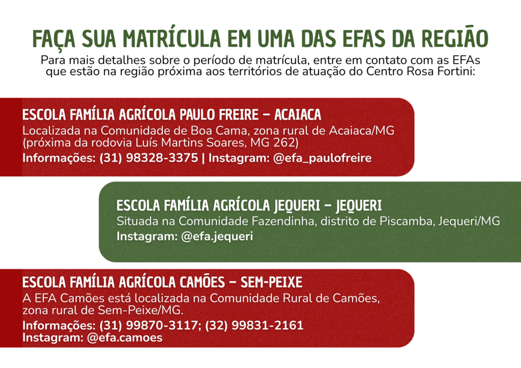 Na região próxima aos territórios de atuação do Centro Rosa Fortini, essa experiência se concretiza por meio da EFA Paulo Freire, em Acaiaca, da EFA Jequeri e da EFA Camões, em Sem-Peixe. As Instituições de Acaiaca e Sem Peixe trabalham com o modelo de Ensino Médio integrado à formação técnica em agropecuária, possibilitando que adolescentes e jovens estudem sem precisar deixar o território, conciliando a vida escolar com a realidade das comunidades onde vivem. A EFA de Jequeri, no momento, trabalha somente com o modelo EJA – Educação de Jovens e Adultos, auxiliando na conclusão dos estudos.