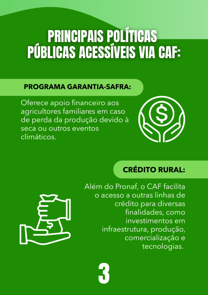 O Cadastro Nacional da Agricultura Familiar (CAF) é o documento que identifica oficialmente quem faz parte da agricultura familiar no Brasil. Ele é a principal ferramenta usada pelo governo federal para planejar e aplicar políticas públicas voltadas a esse público. O cadastro fica disponível durante todo o ano para inscrições e atualizações.