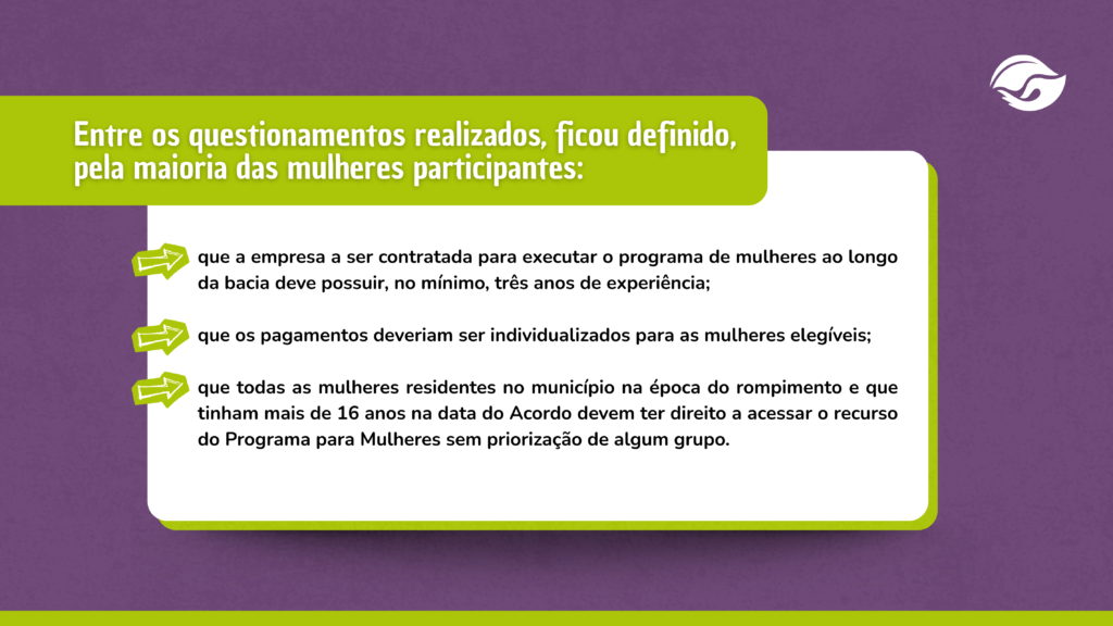 As mulheres sofreram discriminação no processo de reparação conduzido pela Renova, já que muitos dos seus modos de trabalho e de sustento não foram reconhecidos. Foi a partir desse diagnóstico que foi pactuado esse programa. A coordenação e execução desse programa são de responsabilidade das Instituições de Justiça (IJs), quais sejam, Defensorias Públicas e Ministérios Públicos.