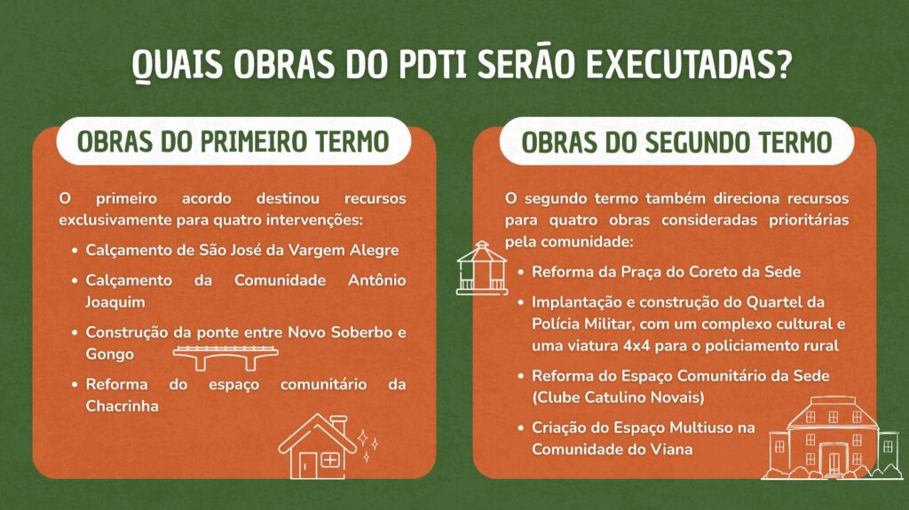 - Setembro: o segundo Termo formalizou um novo repasse, desta vez de R$ 11,6 milhões, ampliando a capacidade do município de executar as obras previstas no PDTI.